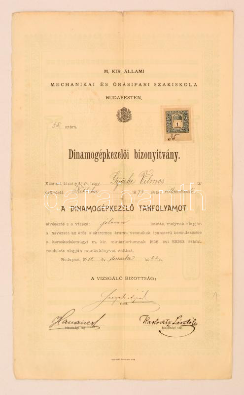 1910 Dinamogépkezelői bizonyítvány, M. Kir. Állami Mechanikai és Órási... https://www.darabanth.com/de/278-Fernauktion/278.0/Andere-Sammelgebiete/Dokument~37/1910-Dinamogepkezeloi-bizonyitvany-M-Kir-Allami-Mechanikai-es-Orasipari-szakiskola-Budape~II1431193