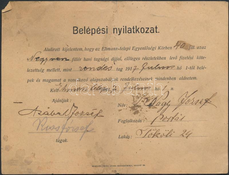 1917 Az Ehmann-telepi Egyenlőségi Kör belépési nyilatkozata https://www.darabanth.com/de/278-Fernauktion/278.0/Andere-Sammelgebiete/Dokument~37/1917-Az-Ehmann-telepi-Egyenlosegi-Kor-belepesi-nyilatkozata~II1428958
