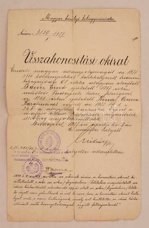 Beschreibung: 1927 Visszahonosítási okirat budapesti lakosok részére; honpolgári esküvel, okmánybélyegekkel, hajtva, szakadással, 34×21 cm