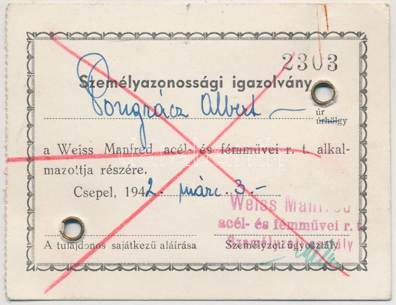 1942 Csepel, Személyazonossági igazolvány a Weiss Manfréd acél- és fém... https://www.darabanth.com/de/278-Fernauktion/278.0/Andere-Sammelgebiete/Dokument~37/1942-Csepel-Szemelyazonossagi-igazolvany-a-Weiss-Manfred-acel-es-femmuvei-rt-alkalmazott~II1428432