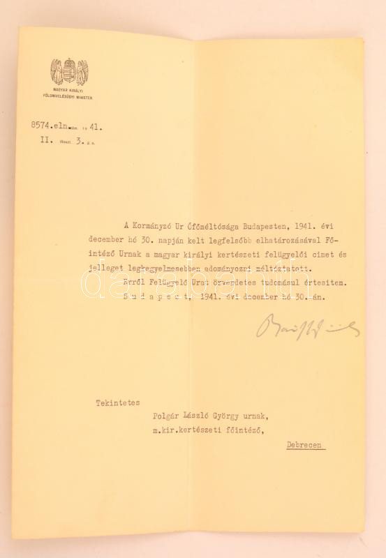 1943 Bp., Polgár László György m. kir. kertészeti felügyelőnek küldött kinevezési okmány a m.kir. földművelésügyi minisztériumból, rajta Bánffy Dániel miniszter aláírásával