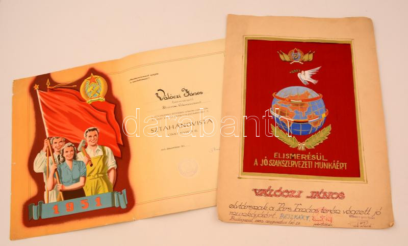 Beschreibung: 1946-1953 Budapest Székesfővárosi Közlekedési Részvénytársaság által kiadott sztahanovista oklevelek, állandósító irat, 3 db
