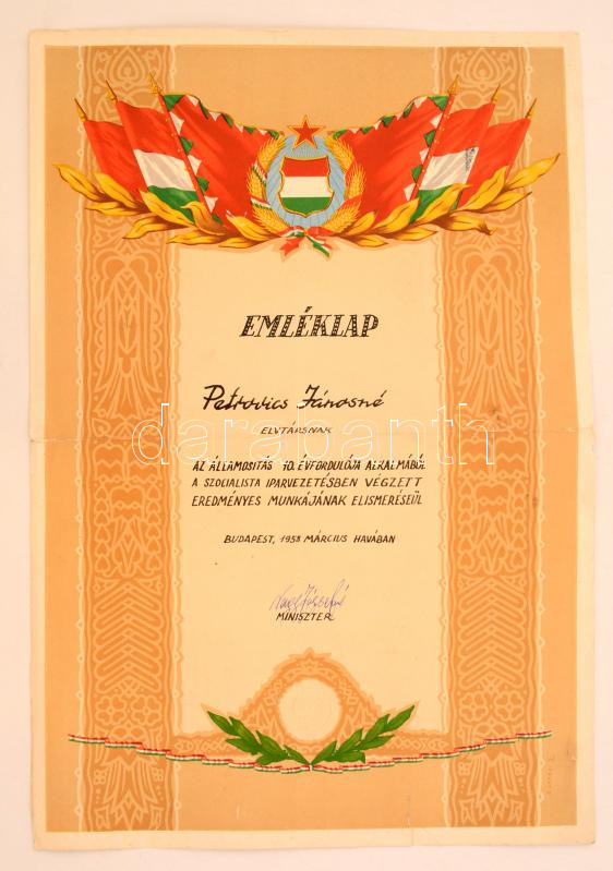 Beschreibung: 1958 Emléklap a szocialista iparvezetésben végzett érdemekért, Nagy Józsefné Szarka Jolán (1921-1999) könnyűipari miniszter aláírásával