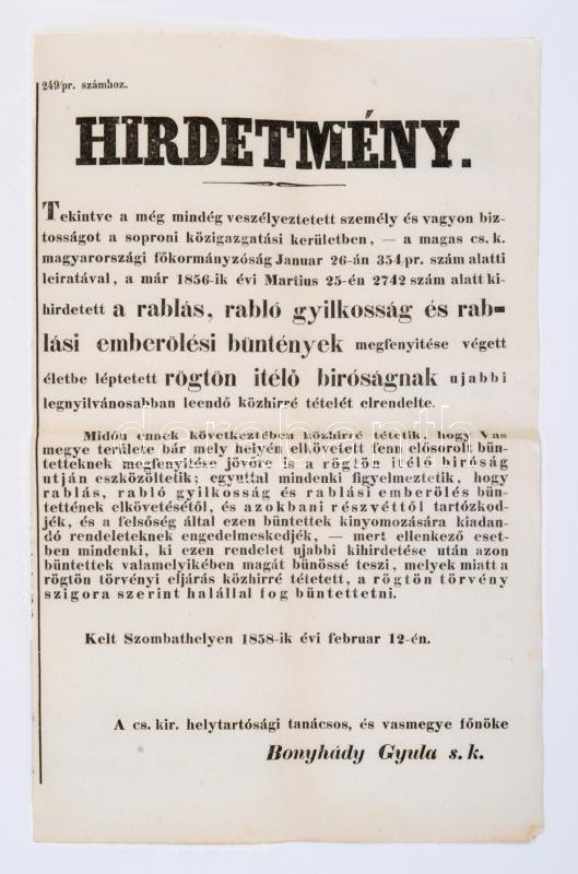 Beschreibung: 1858 Statáriumra figyelmeztető kétnyelvű hirdetmény. soproni kerület. 44x34 cm