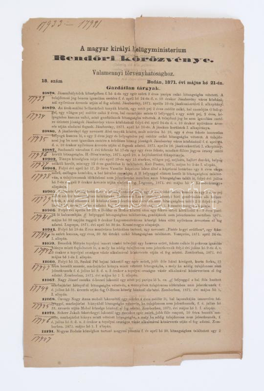 1871 Buda, A magyar királyi belügyministerium rendőri körözvénye valam... https://www.darabanth.com/de/278-Fernauktion/278.0/Andere-Sammelgebiete/Drucksachen~5/1871-Buda-A-magyar-kiralyi-belugyministerium-rendori-korozvenye-valamennyi-torvenyhatosag~II1431182