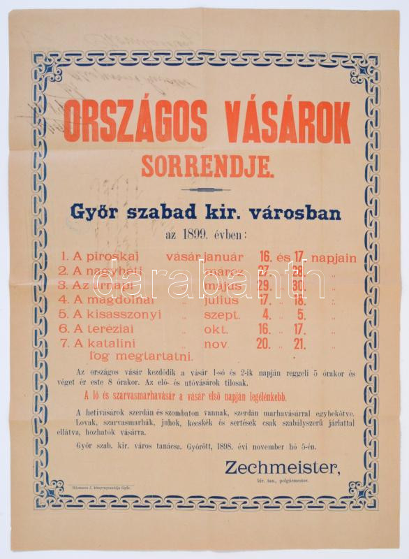 1898 Győr városában megtartott országos vásárok hirdetménye 43x60 cm https://www.darabanth.com/de/278-Fernauktion/278.0/Andere-Sammelgebiete/Drucksachen~5/1898-Gyor-varosaban-megtartott-orszagos-vasarok-hirdetmenye-43x60-cm~II1432643