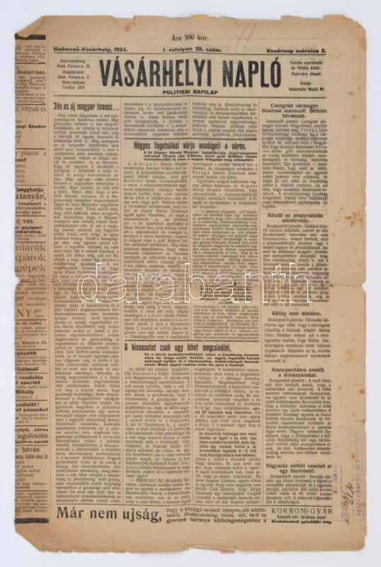 1924 A hódmezővásárhelyi Vásárhelyi Napló 1. évf. 25. száma érdekes ír... https://www.darabanth.com/de/278-Fernauktion/278.0/Andere-Sammelgebiete/Drucksachen~5/1924-A-hodmezovasarhelyi-Vasarhelyi-Naplo-1-evf-25-szama-erdekes-irasokkal-a-szegedi~II1431344