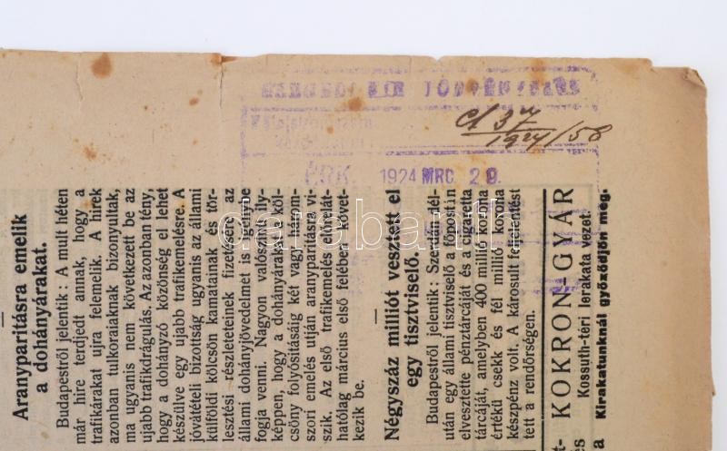 Beschreibung: 1924 A hódmezővásárhelyi Vásárhelyi Napló 1. évf. 25. száma érdekes írásokkal, a szegedi királyi törvényszék érkeztető bélyegzőjével