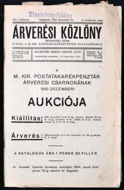 1933 az Árverési Közlöny 14. évf. 4. rendkívüli száma (tiszteletpéldánya) benne az aukció részletei, árak, ceruzás jegyzetekben leütési ár. Kissé viseltes papírkötésben,egyébként jó állapotban.pp.:119, 23x15cm