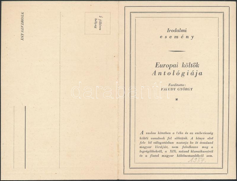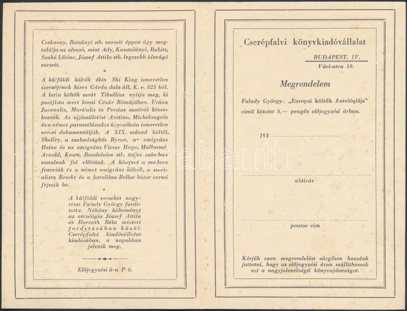 1937 A Cserépfalvi Könyvkiadóvállalat megrendelőlapja a Az Európai köl... https://www.darabanth.com/de/278-Fernauktion/278.0/Andere-Sammelgebiete/Drucksachen~5/1937-A-Cserepfalvi-Konyvkiadovallalat-megrendelolapja-a-Az-Europai-koltok-antologiaja-cim~II1428533