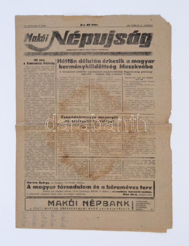 1948 a Makói Népújság 4. évf. 38. száma érdekes írásokkal, a szegedi t... https://www.darabanth.com/de/278-Fernauktion/278.0/Andere-Sammelgebiete/Drucksachen~5/1948-a-Makoi-Nepujsag-4-evf-38-szama-erdekes-irasokkal-a-szegedi-torvenyszek-erkezt~II1431349