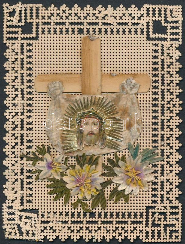 Beschreibung: cca 1900 Rátétes csipke szentkép pasiflóra kereszttel, kis hibával, 10x8cm