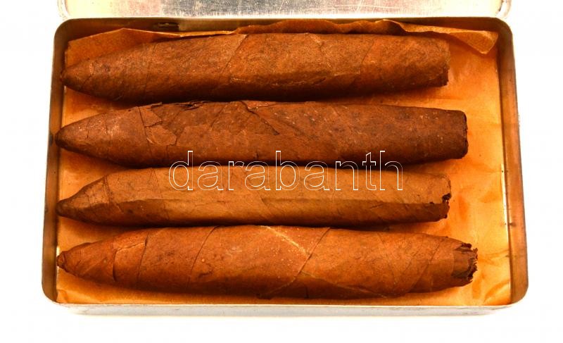Beschreibung: "1848-1948 centenárium" feliratú fém szivaros doboz, 4 db szivarral