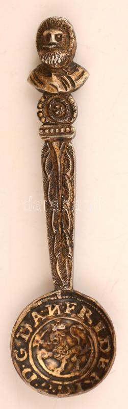 Beschreibung: Dán pénzérméből kialakított, férfifej figurás fém kanál, h: 6 cm.