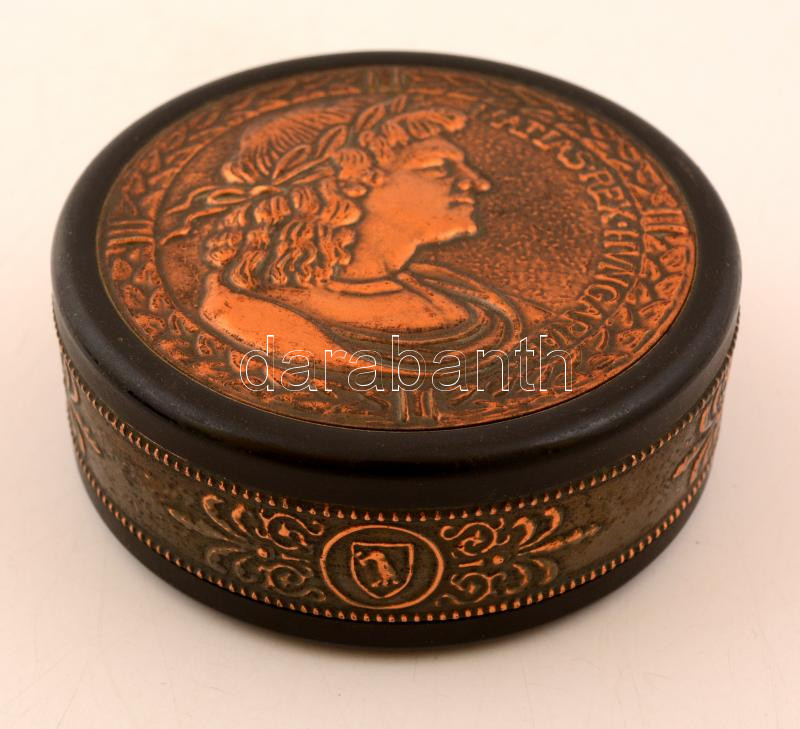 Beschreibung: Sárközi Népi Iparművészeti Szövetkezet, Decs: Mátyás király arcképével díszített dobozka d: 10 cm