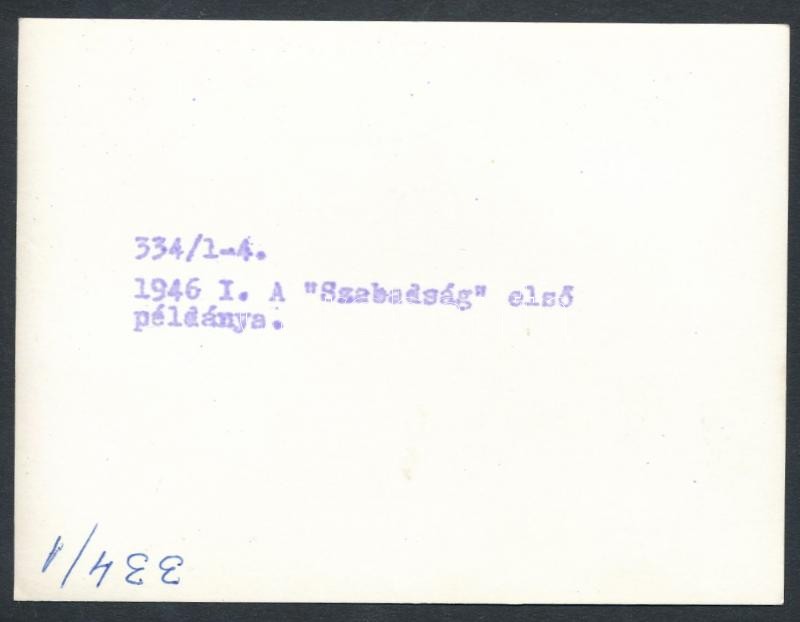 Beschreibung: 1946 A Szabadság Demokratikus Napilap első példánya, hátoldalon feliratozott sajtófotó, 9x12 cm