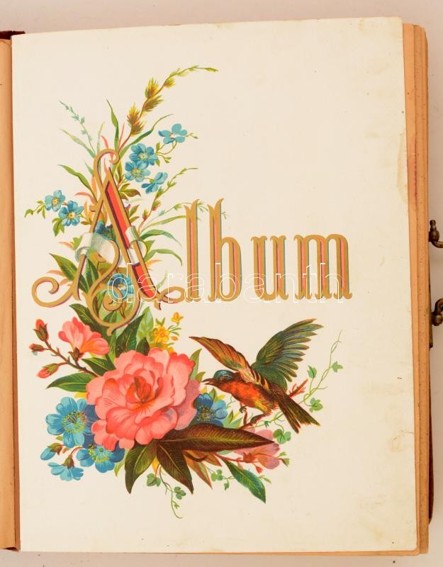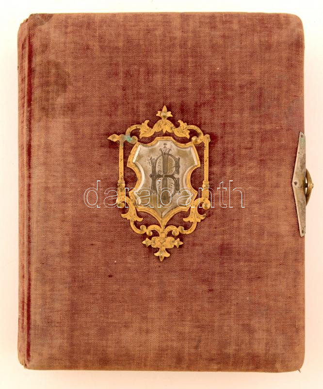 cca 1890-1918 Nemes és főúri családok fényképeit (66 db) tartalmazó fotóalbum fémveretes vászonkötésben, sérült állapotban / 66 mixed mainly CDV photos of Hungarian noblemen and women in damaged album