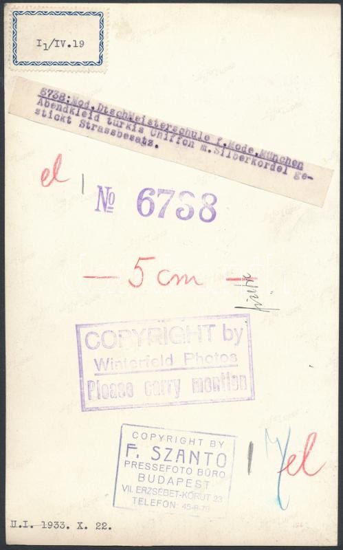 Beschreibung: cca 1933 Amerikai női divatfotó, Winterfeld műterméből, hátoldalon a Szántó F. Műszaki és Sajtófotó Iroda pecsétjével, 24×14 cm