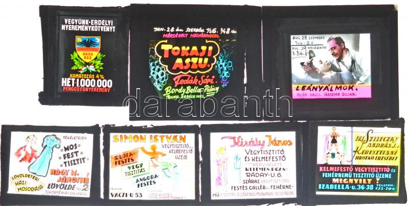 cca 1943 Fekete György (1904-1990) budapesti fényképész reklámgrafikái különféle szolgáltatásokról, termékekről, ezekről készített mozikban vetíthető üveglemez diapozitív képeket, az eladásra kínált tétel 13 db 7x6 cm és 9x8 cm-es méretű üveglemez diapozitív reklámot tartalmaz