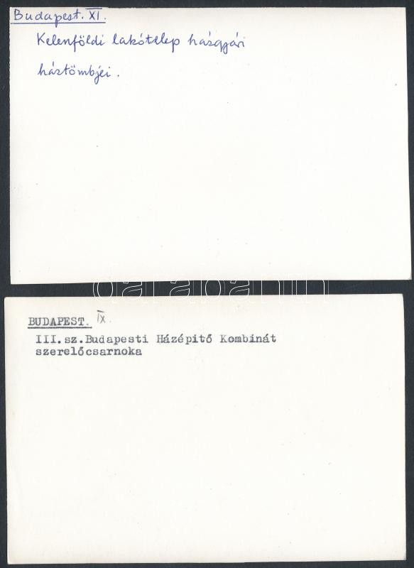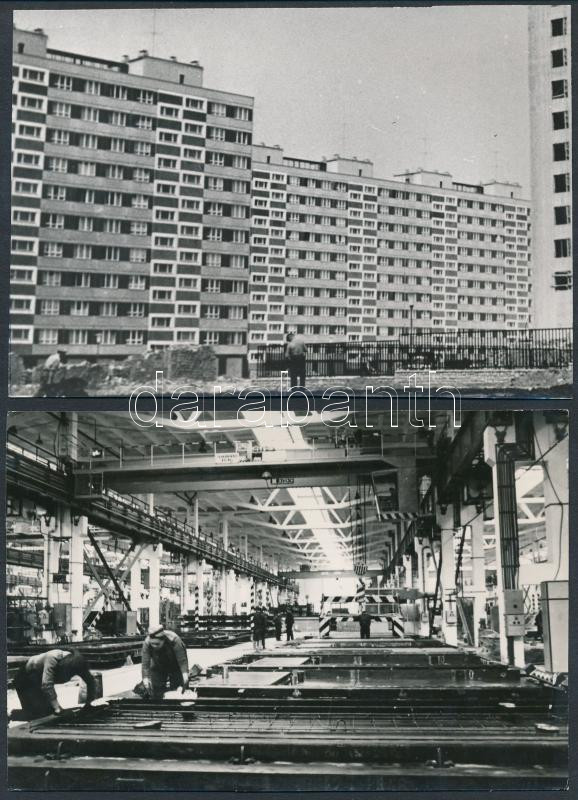 cca 1970 Budapest, A kelenföldi lakótelep házgyári háztömbjei, III. számú budapesti házépítő kombinát szerelőcsarnoka, 2 db fotó, hátoldalon feliratozva, 10x14 cm