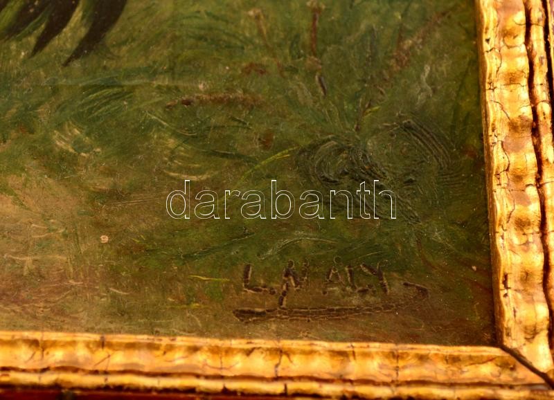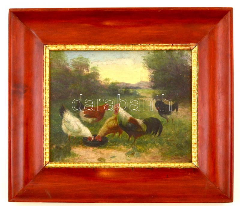Beschreibung: Olvashatatlan jelzéssel: Tyúkok a szabadban. Olaj, falemez, keretben, 25×30 cm
