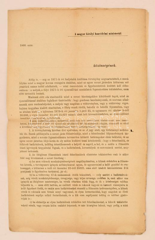 Beschreibung: 1871 Bp., A magyar királyi honvédelmi minisztertől, Csengery Imre miniszteri tanácsos által kiadott, sorozásról, újoncozásról szóló rendelet