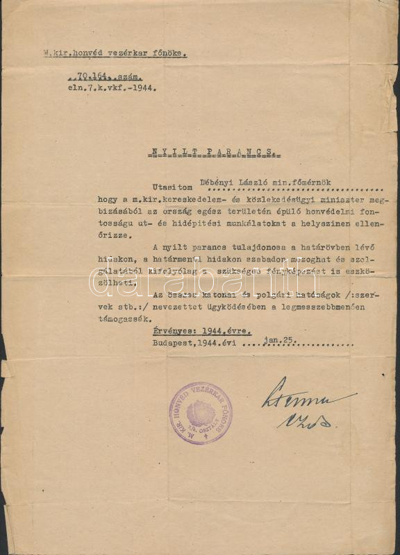 1944-1945 Bp., A m. kir honvéd vezérkar főnöke által min. főmérnöknek ... https://www.darabanth.com/de/278-Fernauktion/278.0/Andere-Sammelgebiete/Militaria~2/1944-1945-Bp-A-m-kir-honved-vezerkar-fonoke-altal-min-fomernoknek-kiadott-nyilt-parancs~II1429063