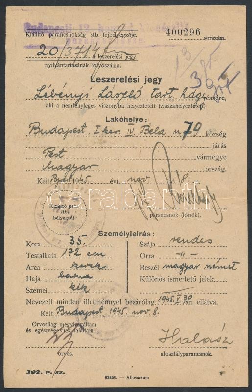 Beschreibung: 1944-1945 Bp., A m. kir honvéd vezérkar főnöke által min. főmérnöknek kiadott nyílt parancs + leszerelési jegy, 2 db