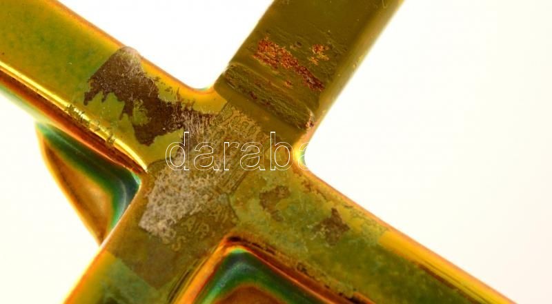 Beschreibung: Zsolnay eozin mázas feszület, jelzett, hátoldalán gyári máz hibával, m:10 cm