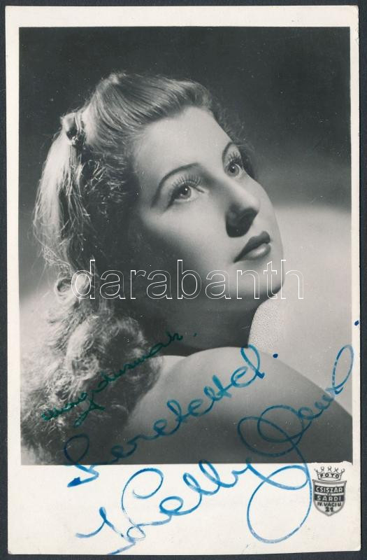 Beschreibung: Kelly Anna (1919-1965) énekesnő dedikált fotólapja, Csiszár és Sárdi felvétele, 13x8 cm.