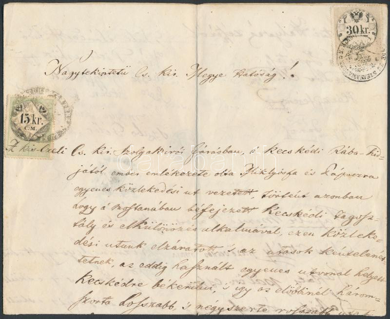 Beschreibung: ~1860 15kr CM + 30kr okmánybélyeg okmányon