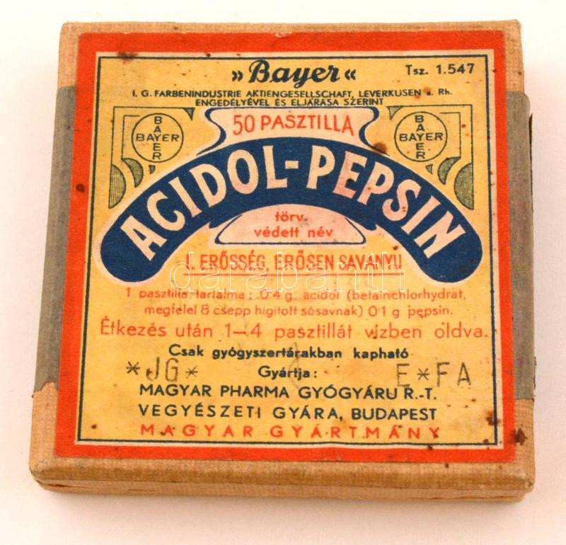 Bayer Acidol-Pepsin pasztilla, gyógyszeres papírdoboz / pill box https://www.darabanth.com/de/278-Fernauktion/278.0/Andere-Sammelgebiete/Werbungen~42/Bayer-Acidol-Pepsin-pasztilla-gyogyszeres-papirdoboz-pill-box~II1429982