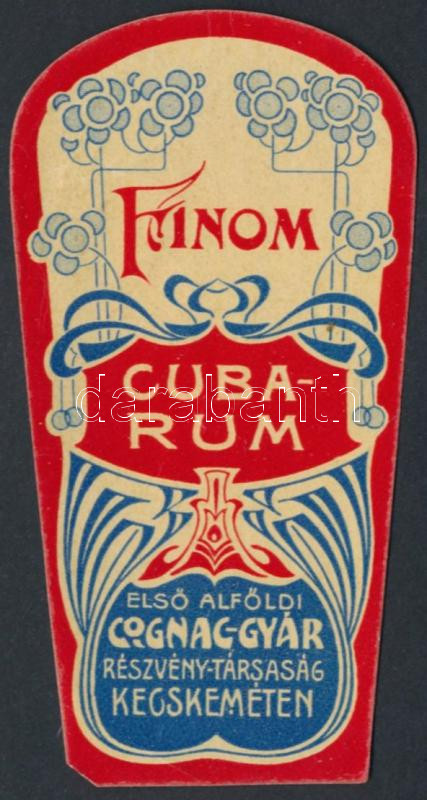 Finom Cuba Rum, Első Alföldi Cognac-Gyár Rt., italcímke, 9x4 cm. https://www.darabanth.com/de/278-Fernauktion/278.0/Andere-Sammelgebiete/Werbungen~42/Finom-Cuba-Rum-Elso-Alfoldi-Cognac-Gyar-Rt-italcimke-9x4-cm~II1431766