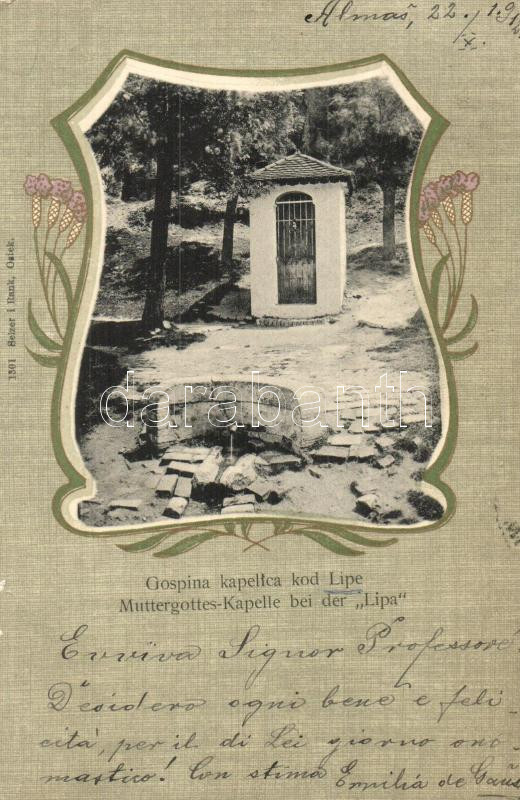 Almás, Aljmas; Muttergottes-Kapelle bei der Lipa / kápolna, forrás / c... https://www.darabanth.com/de/278-Fernauktion/278.0/Ansichtskarten/Kroatien~200009/Almas-Aljmas-Muttergottes-Kapelle-bei-der-Lipa-kapolna-forras-chapel-spring-Art-Nouveau-~II1430767