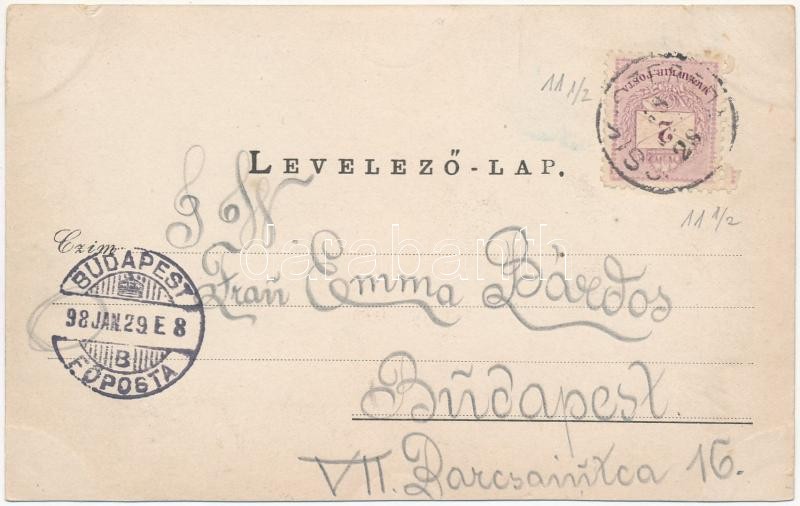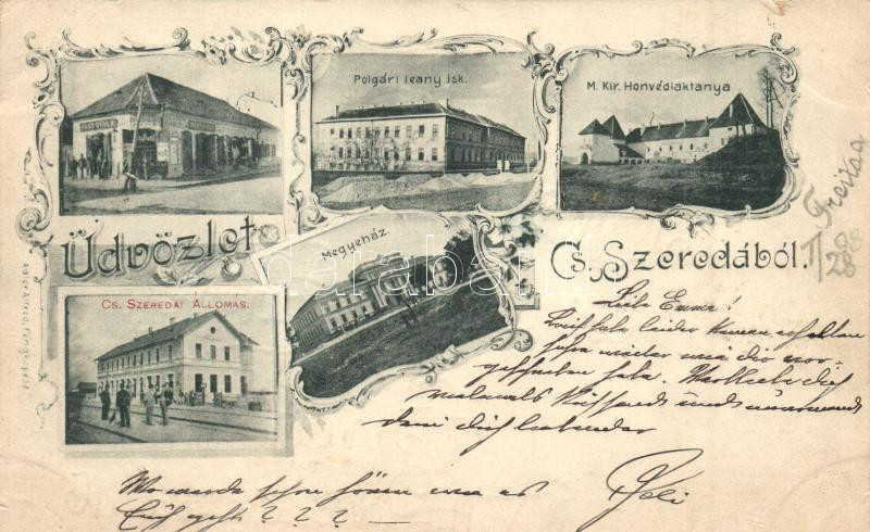 1898 Csíkszereda, Miercurea Ciuc; vasútállomás, Polgári leányiskola, Honvédlaktanya, megyeház, Nagy Gyula üzlete, Adler Alfred fényképész / railway station, girl school, military barracks, county hall, shop, Art Nouveau (vágott / cut)