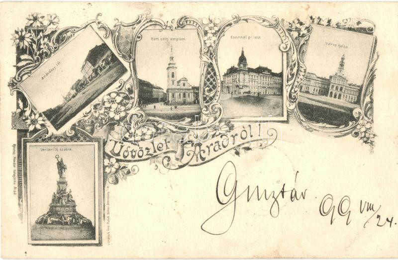 1899 Arad, Andrássy tér, Csanádi palota, városháza, Vértanúk szobra, kiadja Révész Nándor / square, palace, town hall, statue, floral (Rb)