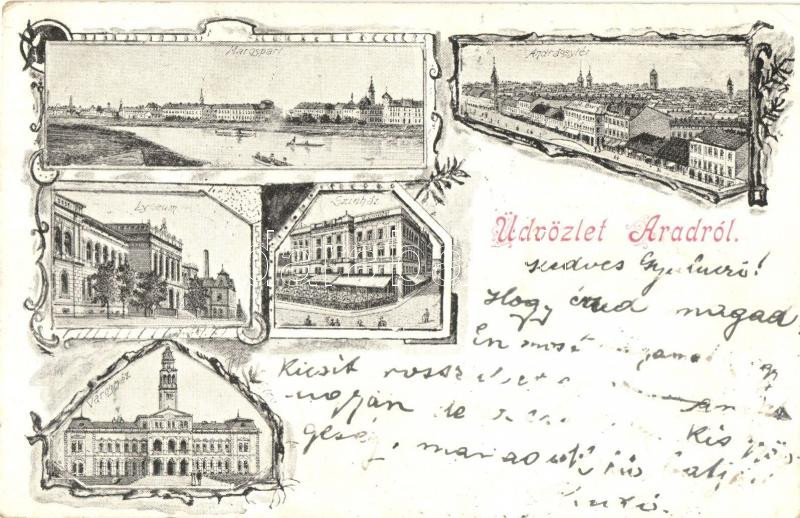 1899 Arad, Marospart, Andrássy tér, líceum, Városház, színház / river bank, square, lyceum, town hall, theatre, floral