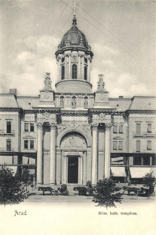 Arad, Római katolikus templom, Muskai M. üzlete / church, shop https://www.darabanth.com/de/278-Fernauktion/278.0/Ansichtskarten/Siebenburgen~200006/Arad-Romai-katolikus-templom-Muskai-M-uzlete-church-shop~II1430603