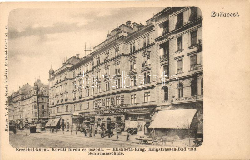 Beschreibung: Budapest VII. Erzsébet körút, körúti fürdő és uszoda, lámpagyár, kiadja Burger V.