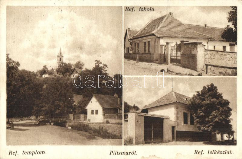 Beschreibung: Pilismarót, Református templom, iskola, lelkészlak, Hangya szövetkezet kiadása (fa)