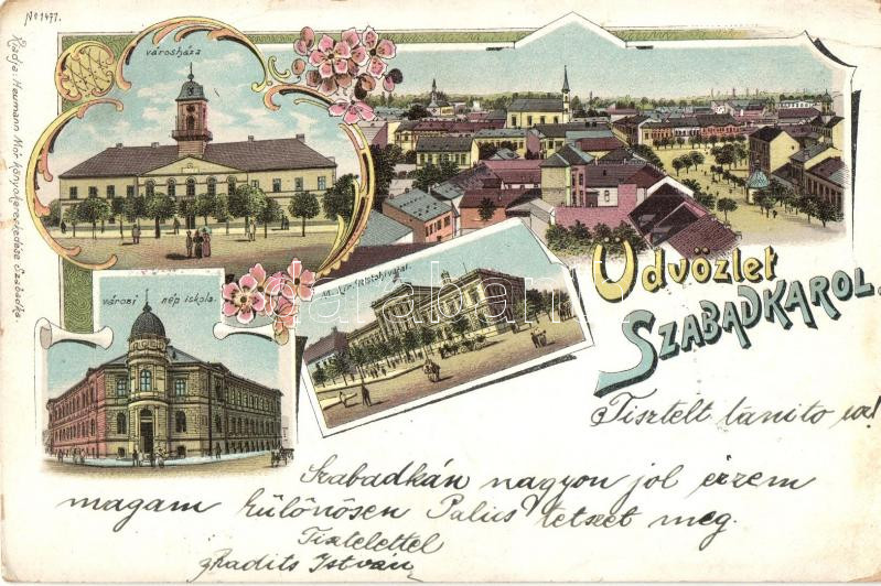 Beschreibung: 1898 Szabadka, Subotica; Városháza, Városi népiskola, Postahivatal / town hall, school, post office, floral, Art Nouveau litho (EB)