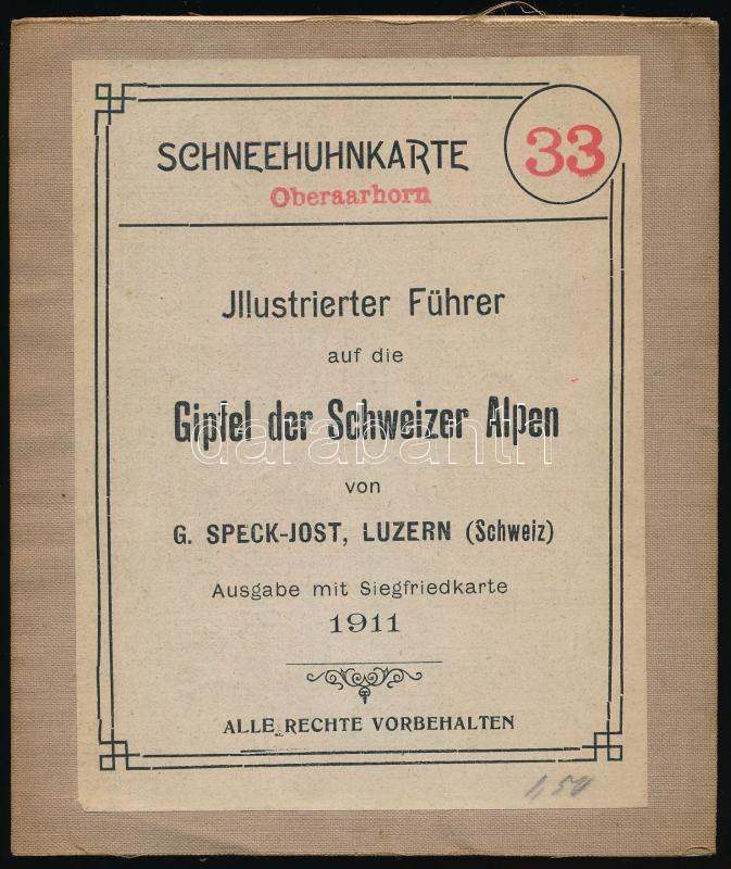G. Speck-Jost: Illustrierter Führer auf die Gipfel der Schwiezer Alpen. Schneehuhnkarte 33. Oberaarhorn. Luzern, 1911, Schneehuhnkarte. Német nyelvű kiadvány, jó állapotban. / In german language.