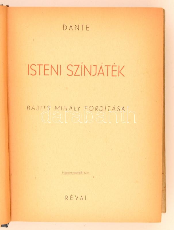Dante: Isteni színjáték. Babits Mihály fordítása. Budapest, 1945, Réva... https://www.darabanth.com/de/278-Fernauktion/278.0/Bucher/Bucher-Sonstige-Raritaten~33/Dante-Isteni-szinjatek-Babits-Mihaly-forditasa-Budapest-1945-Revai-Kiadoi-picit-foltos~II1428045