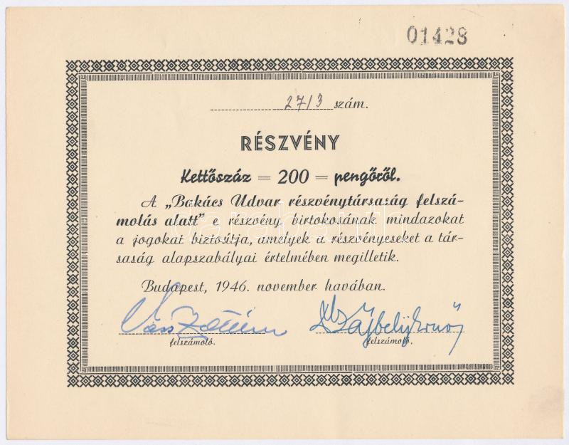 Budapest 1946. "Bakács Udvar részvénytársaság felszámolás alatt" részv... https://www.darabanth.com/de/278-Fernauktion/278.0/Numismatik/Aktien-und-Tickets~300019/Budapest-1946-Bakacs-Udvar-reszvenytarsasag-felszamolas-alatt-reszveny-200P-rol-TI-~II1427480