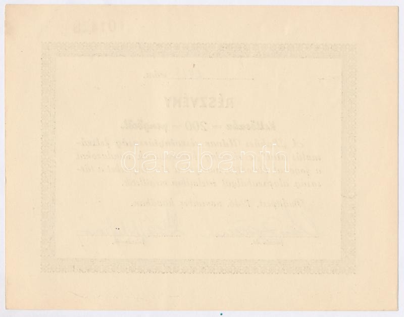 Beschreibung: Budapest 1946. "Bakács Udvar részvénytársaság felszámolás alatt" részvény 200P-ről T:I-