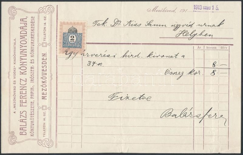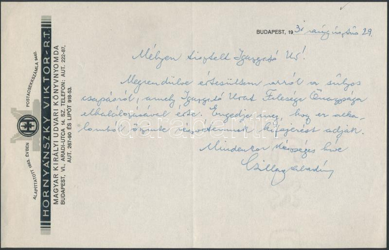 1913-1931 3 db Könyvnyomda számla (Hornyánszky Viktor Rt., Viktória Könyvnyomda, Balázs Ferencz Könyvnyomdája), fejléces, a Hornyánszky számlán levél, 23x15 cm. és 23x14 cm. között méretben.