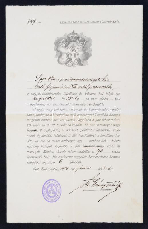 1914 Kegyesrend felvételről szóló oklevél a rendfőnök aláírásával https://www.darabanth.com/de/279-Fernauktion/279.0/Andere-Sammelgebiete/Dokument~16/1914-Kegyesrend-felvetelrol-szolo-oklevel-a-rendfonok-alairasaval~II1439744