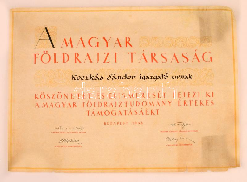 1938 A Magyar Földrajzi Társaság köszönő oklevele Koczkás Sándor (1898... https://www.darabanth.com/de/279-Fernauktion/279.0/Andere-Sammelgebiete/Dokument~16/1938-A-Magyar-Foldrajzi-Tarsasag-koszono-oklevele-Koczkas-Sandor-1898-1956-iskolaigazgato~II1439526