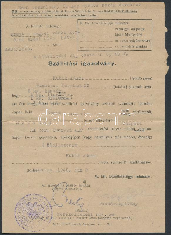Beschreibung: 1945 A szentesi megyei közélelmezési hivatal szállítási igazolványa szentesi lakos részére, másodlattal együtt
