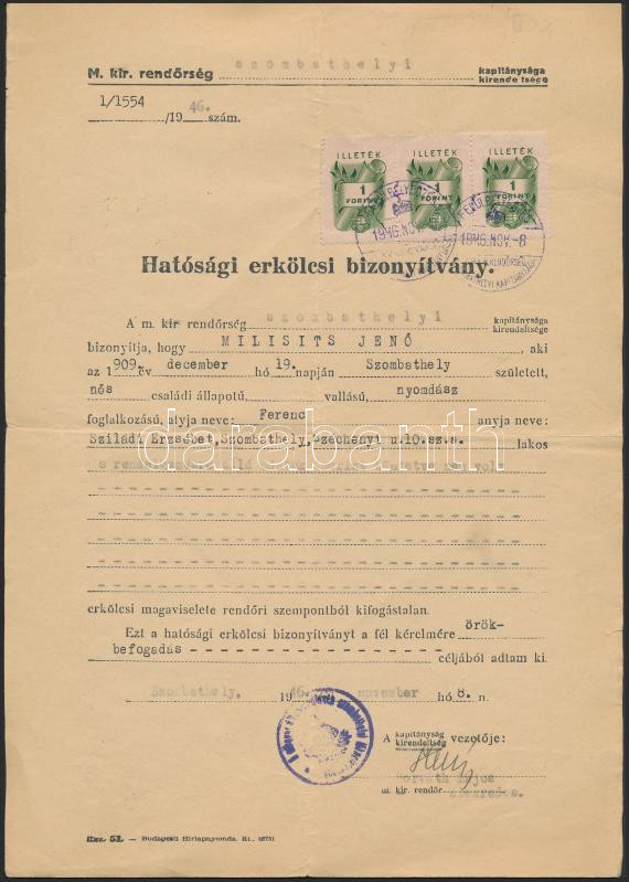 1946 A magyar királyi rendőrség szombathelyi kirendeltsége által kiállított hatósági erkölcsi bizonyítvány nyomdász részére örökbefogadás céljából, okmánybélyegekkel